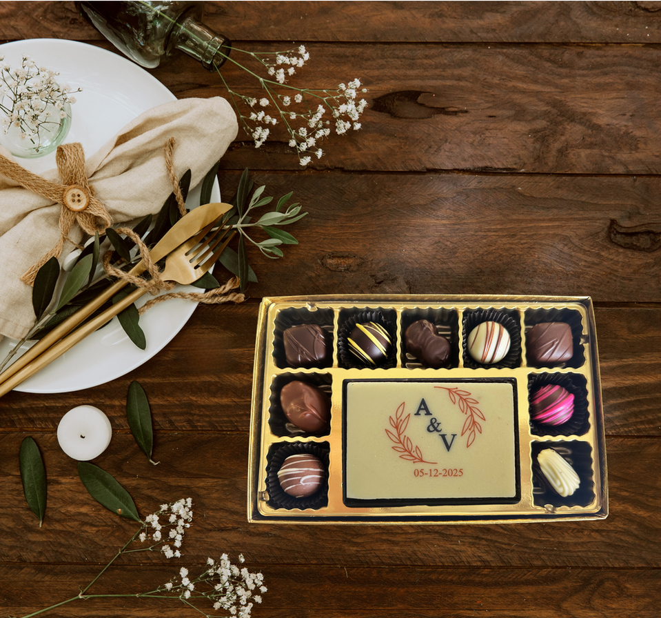 Make your mark with our Signature 10-Piece Chocolate Box with Custom Printed Centerpiece — a luxurious blend of indulgence, craftsmanship, and identity.